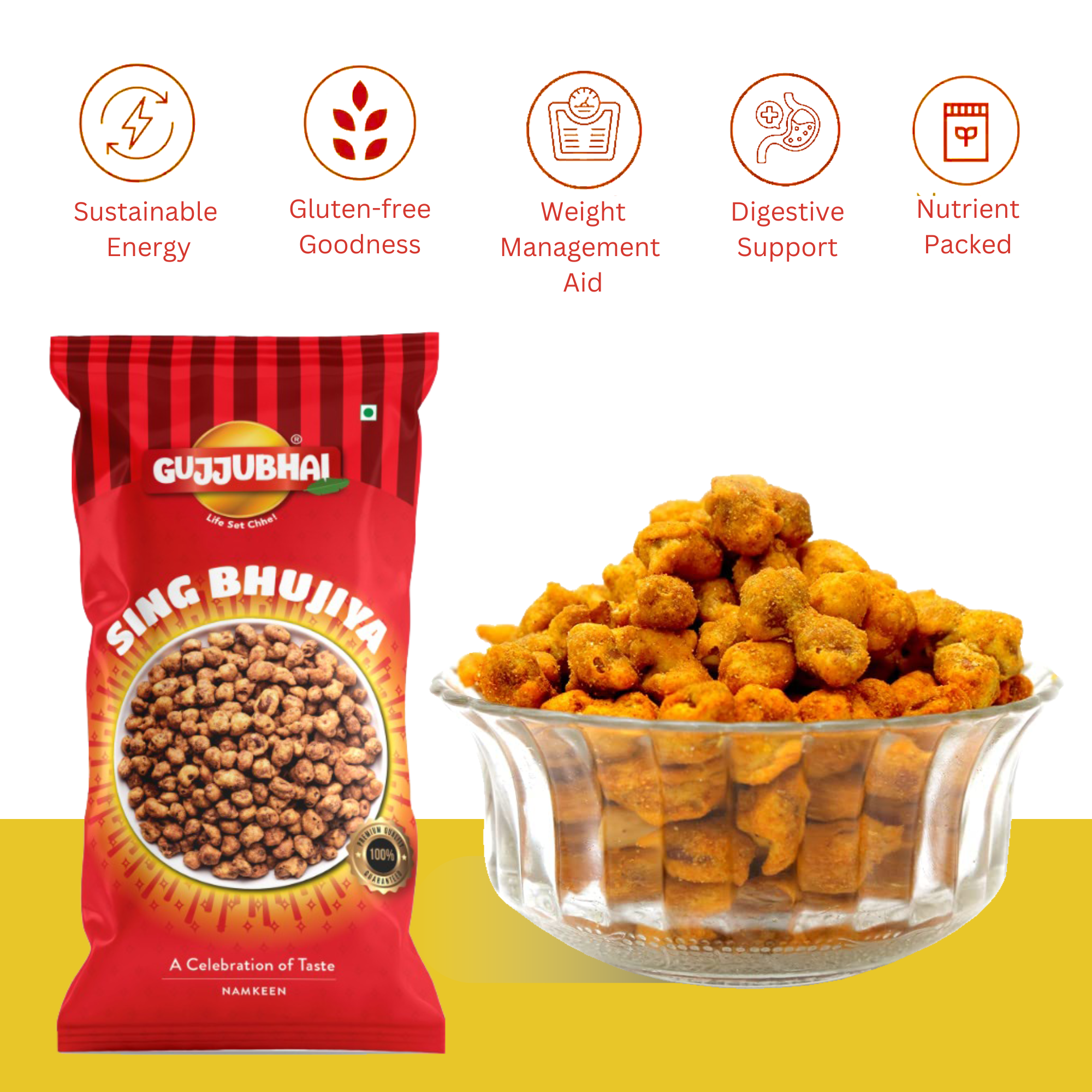Spicy, crunchy, and full of flavor – GujjuBhai’s Sing Bhujia is the ultimate snack made from premium peanuts and traditional spices. A perfect tea-time partner!